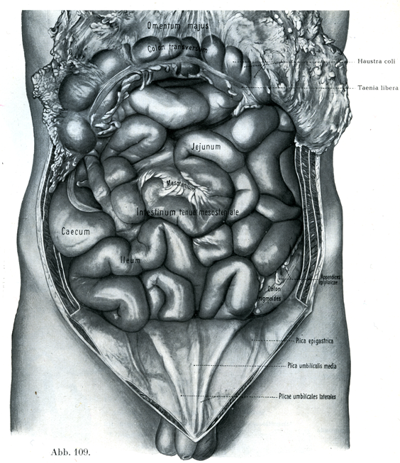 [図109]腹部内臓の位置関係II 腸のうねりを示す.大網と横行結腸を上方に飜えしてある.