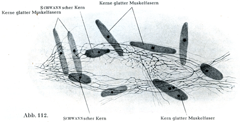迷走神経と交感神経の線維および粘膜下神経叢と腸筋神経叢の神経細胞の突起はPh. Stöhr jr. のいう“神経性の終末細網”nervöses Terminalretikulumをつくっている(Z. Zellforsch., 21. Bd.,1934;27. Bd.,1937) これはひじょうに小さい網の目をもつ極めて繊細な網材である(図112).これが平滑筋線維・結合組織細胞・腺細胞・神経細胞をつつんでいて,これからでるごく細い原線維がその支配をうける細胞の細胞体のなかにまで入りこむのである.