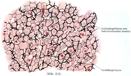 [図151]家兎の膵臓における毛細胆管と分泌液胞 クローム銀染色であらわしてある.アラウン・カルミソで後染色をほどこしてある(J. Sobotta作製)