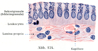 微細構造.上下の膵臓は複合胞状腺であって,大小いろいろの不規則な多面形をした小葉からできている(図155).小葉のあいだは結合組織によって分けられ,同時にゆるく連ねられている.小葉間結合組織のなかを導管がとおる.この導管に多くの枝分れをもつ長い峡部がきて開口する.分泌作用の行われる終末部すなわち腺体は低い円柱状あるいは円錐状の細胞からなり,この細胞の腺腔に面した部分には光をつよく屈折する多数の顆粒(酵素原顆粒Zymogenkbrnchen)がふくまれている(図156).周囲の方の比較的明るい部分に核がある.顆粒に富む細胞体の部分の厚さが機能の時期によって変化する.