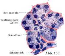 [図156]ヒトの膵臓の終末部 腺房中心細胞と峡部をもっている.(K. W. Zimmermann作製)