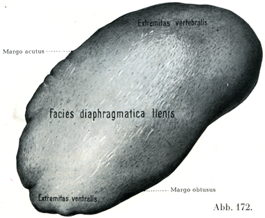 横隔面(図172)は平滑であって,腹膜によって被われ,横隔膜に接している.内臓面(図171)は血管が入ってくる所に当たってへこみ,すなわち脾門Hilus lienisがあって,これにより前後の2部に分れ,両部ともその大部分がやはり腹膜で被われている.前部はいっそう広くて胃底に密接していて,それゆえ胃部Pars gastricaとよばれ,後方は腎部Pars renalisといい,ここは左の腎臓と腎上体ならびに横隔膜の腰椎部に接する.しばしば鈍い稜線が胃部と腎部を分け,かつ脾門をふくんでいる.膵尾と左結腸曲が内臓面の下部に達していて,ここは膵部Pars pancreaticaとよばれる.鋭縁は多くのばあい,それも主として前端の近くで,溝または切れこみをもっている.前端は横隔結腸ヒダの上にのっている.椎骨端は多くは鈍い円みを呈して終り,横隔膜の円天井に接している.脾門の位置は後胃間膜の胃脾部の付着部に相当する.