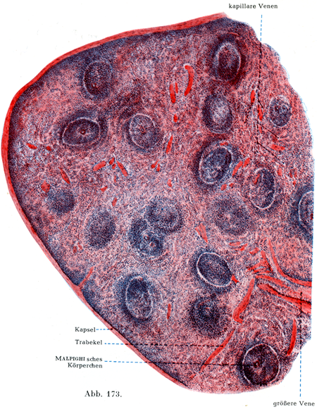 構造.脾臓はまず漿膜で被われて,その内方に丈夫な被いがあり,この2つを合せて脾被膜Capsula lienis, Milzkapsel(図173)という.この2つの膜のあいだには漿膜下すなわち浅層のリンパ管網が入りこんでおり,両膜はたがいに密につながっている.白膜Albugineaは固い結合組織性の膜で弾性線維および多くの動物では)平滑筋をふくんでいる.それによって囲まれた内容である脾髄Pulpa lienisは軟くてたやすく切られる.脾髄の色は暗調の褐赤ないし青赤であって,空気にふれると明るい赤色となる.