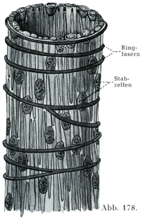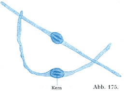 赤脾髄の静脈性毛細管はその腔所がはなはだ広くて(80~150µ),壁がごく薄い.その壁は特別な形をした内皮細胞のただ1層からなり,この内皮細胞の列が周囲のリンパ性組織の線維によって管の形にまとめられているのである.おのおのの内皮細胞は細長くのびて,両端がとがった棒の形をしている(杵状細胞Stabzellen),その核は細胞の全長のおよそ中央にあって(図175),そこで細胞体を血管の内腔にむかつて強くもり上げている.杆状細胞には中央部に比較的密な1本のすじがあり,側方部に2本の縦のすじがある.あい隣る杆状細胞の側方のすじがたがいに接触しているが,しかしそれらの間に大小いろいろの口や,かなり大きい隙間のあることが多い.