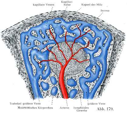 脾臓の血管.腹大動脈からおこる腹腔動脈の最大の枝である脾動脈が6本あるいはそれ以上の枝に分れて脾門から入る(図171).そして脾臓の内部で速かに枝分れするが,その諸枝のあいだに吻合がない,すなわち終動脈Endarterienをなしている.マルピギー小体のなかで細い動脈が突然に多数の細い枝に分れて,それが筆毛状にみえるので,この細かく分れた部分を筆毛動脈Penicillusというのである.マルピギー小体からでてきた細い毛細管が結合組織性の特別な鞘でかこまれる.これを毛細管の莢Kapillarhülseあるいは毛細管鞘Kapillarscheide (Schweigger-Seidel)という.この毛細管が直接に毛細管性の静脈に注いでいる(図174,177).後者から血液がいっそう太い静脈にあつまり,この静脈が脾柱とともに走って,けっきょくその全部が脾静脈に集るのである.