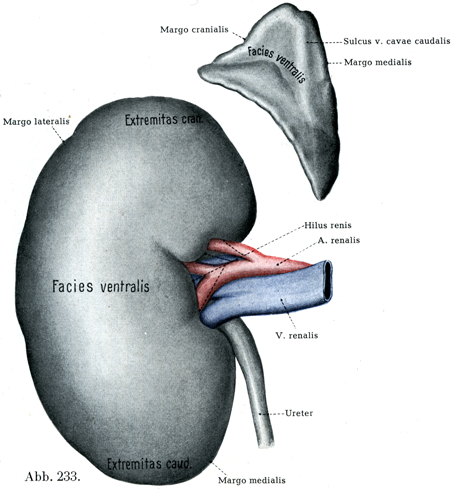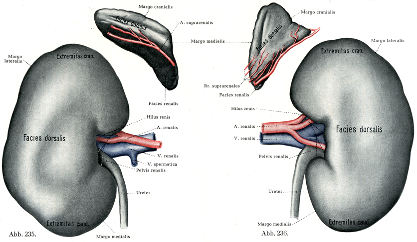 III. 他の諸器官との関係としては腎臓の後方に横隔膜,腰方形筋腹横筋がある.右の腎門に接して下大静脈と十二指腸下行部とがある.左の腎門に接しては大動脈がある.上端にはそれぞれのがわの腎上体がのっており,これは前面と内側縁の上にもわずかながら達している.腎門には腎動静脈および神経があり,さらにリンパ節と尿管もあって,これらは脂肪組織で取り囲まれている.しかもそれらの位置関係は腎盂と尿管がいちばん後方にあり,それも尿管のほうが下にある.それに対して静脈は最も前方にあり,動脈はそれにまつわりついている神経とともに上述の両者のあいだを通ってはいっている.