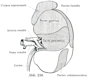 右腎の前面には肝臓面,結腸結腸間膜面,十二指腸面Facles hepatica, colomesocolica, duodenalisがある.また上内側縁は腎上体面Facles suprarenalisをもっている.それに対して左腎の前面には胃面Facles gastrica,膵臓面Facles pancreatica,結腸結腸間膜面Facles colomesocolicaがあり,また脾面Facles lienalisが外側縁にも及んで存在し,上内側縁から前面に少しかかつて腎上体面Facles suprarenalisがある(図164, 237, 238).