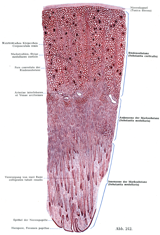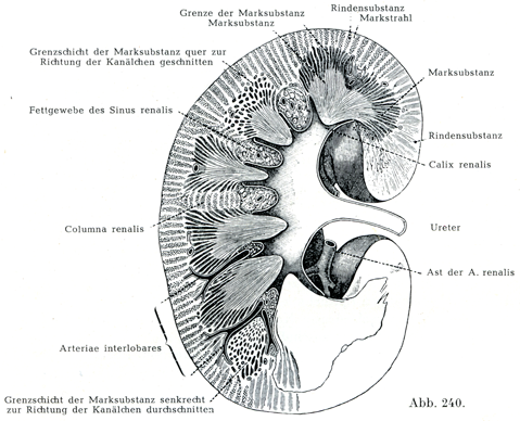 腎臓の実質には色,位置,構造,堅さを異にする2つの部分がある.すなわち皮質と髄質Rinden-und Marksubstanzである(図240, 241).