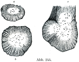 乳頭の頂の表面を落射照明でみると図244 aからcまでに示すようなものが見られ,ここを縦断してみた像(図242, 243)が事がらをいっそうよく理解させる.図244aは人の腎臓の小さな単一乳頭,図244bは大きな単一乳頭,図244cは複合乳頭である.