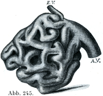 [図245]子供の糸球体1個の鑞模型(W. B. Johnstonによる) ×400 AV 輸入細動脈; EV 輸出細動脈.