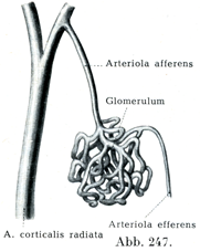 弓の凸縁から規則正しい間隔をおいて皮質内に向かって放射状に放線状皮質動脈Aa. corticales radiatae(図260のという枝を出している.この枝のいちばん外側にある終枝は皮質の毛細管網のなかに直接に合している.しかし放線動脈からでる多数の側枝は輸入細動脈Arteriolae afferentesであって,この細動脈はおのおの1つのマルピギー小体にすすみ,そこで迷網Wundernetzとよ1ばれる動脈性毛細管の網を作り,ふたたび輸出細動脈Arteriola efferensという1本の動脈になって出てゆく(図247).