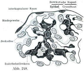 糸球体嚢のなかにある糸玉のような血管の集りを腎糸球体Glomerulum renaleと名づける.血管極はボーマン嚢の単なる隙間では決してなくてその壁が折れ返っているところであり,それには上皮と基礎膜とが関与している(図246).こうして外側の嚢のなかに内側の嚢ができる.内外の両嚢の間には曲部とつながるところの嚢内腔interkapsularer Raumがある.内側の嚢は糸球体をぴったり取りかこみ,また糸球体の小葉の間にも入りこんでいる.内側の嚢をなす細胞が被蓋細胞Deckzellenであって, K. W. Zimmermann(1933)によると人では簡単な形をしていて(図248),個々の細胞の境はあるところではかなりはっきりしているが,あるところではあまりはっきりしていない.