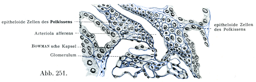 [図251]ヒトの腎臓の輸入細動脈の極枕Polkissen基礎膜と間質結合組織は青.(M. Clara, Arch. Kreislaufforsch., 3. Bd.,1939から)