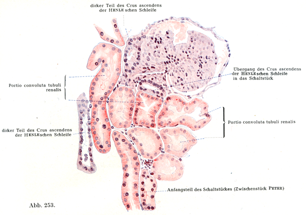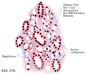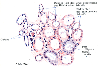 ヘンレ係蹄の最初の太い部分は曲部と同様の性状の上皮細胞をもっている(図252).それにつづく係蹄の下行脚は丈の低い,明るい上皮をもっている(図257, 258).この部では細い管の周りを囲むのがただ1個の細胞で足りている所がしばしばみられ,あるいはその場合になお隣りの細胞の一部分が加わっているという状態である.核は内腔に向かって突出している.内腔は核の在り場所がいろいろ変わっているために波状を呈している.