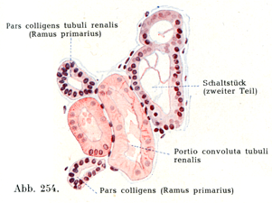 ヘンレ係蹄の第2の太い部分は瓦屋根のようにたがいに並んだ丈の高い1層の上皮細胞からなっていて(図257),“小棒装置”はよく発達していない.しかし介在部,とくにその初まりの部には極めてはっきりした“小棒装置”がある.介在部の第2の部分すなわち結合細管は透明で丈の低い上皮細胞をもっている.この上皮細胞が集合部では高さを増して円柱形になる(図254, 255).第1次の枝,第2次の枝などとそれに乳頭管は円柱細胞をもっている(図257, 258).乳頭の表面は多列円柱上皮で被われ,これが次第に腎杯の移行上皮に移っていく.