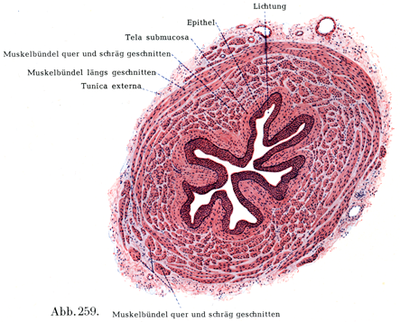 [図259]尿管(腹腔部)37才の男 横断 Böhm(モルモットで)とK. W. Zimmermann(ネコとイヌで)によるとこれらの細胞は多数の深刻な高まりを側方にもっていて,たがいにかみ合っており,そのため表面はきわめていりくんだ様子をしている(図249 c).