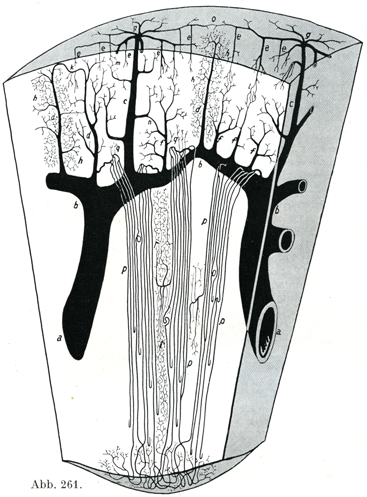 a 葉間静脈;b 弓形静脈;c 星状静脈から起る太い放線状皮質静脈;d 放線状皮質静脈;e 浅皮質静脈;f 深皮質静脈;g 星状静脈;h 毛細管領域の静脈性の部分;i 糸球体があるための空白;k 2本の放線状皮質静脈の末梢根の吻合;l 浅皮質静脈と深皮質静脈の吻合;m 浅皮質静脈と放線状皮質静脈の側枝との吻合;n 深皮質静脈と放線状皮質静脈の側枝との吻合;o 2本の星状静脈の吻合;p 髄質を直走する細静脈;q 髄放線からの静脈の流出路;r 髄質の毛細管網.