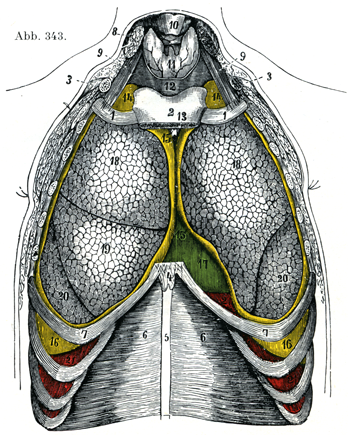 1 第1肋骨;2 胸骨柄;3 鎖骨の肩峰端,その内側部は両側とも取り除いてある;4 剣状突起;5 白線;7腹横筋;7 第7肋骨;8 胸鎖乳突筋;9 前斜角筋;10喉頭;11 甲状腺;12 中頚筋膜;13 前縦隔の上部;14 胸膜頂;15 胸膜の縦隔部;16 胸膜の肋椎部の下界;17 心膜(緑);18 肺の上葉;19 肺の中葉;20 肺の下葉;21 横隔膜.