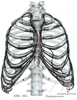 骨格との位置関係では胸膜の下界,いいかえると下胸膜線kaudale Pleuralinieは胸壁において胸膜の横隔部が肋椎部に折れかえる部分の投影線であるが,その走りかたは次のようである.これは個体的にいくぶん異なっている.この線はまず第6肋軟骨に沿っており,ついで第6肋間隙をよぎつて,さらに第7肋骨の骨部と軟骨部の境に達している.そこから上方に凹の弓を画いて第8~第11肋骨の骨部を越えてすすんでおり,その間にますます骨部と軟骨部の境から遠ざかつて,最後に第12肋骨の中央部に達する.そして普通は第12肋骨に沿って第12胸椎体にまで達するのである.ときにはこの線が第12肋骨の走行に沿わないで,その中央部でこれと交叉して脊柱にすすんでいる(この異常は腎臓の手術にさいし重要である).また左の下胸膜線はすでに述べたとおり常に右のよりも少し下方にある(図343~345).