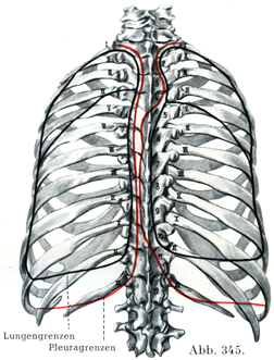 前胸膜線ventrale Pleuralinie,すなわち胸骨のところで肋椎部が縦隔部に折れかえる部分を投影した線と胸郭との関係を知ることも同じように重要である(図343, 344).胸骨柄の後面では左右の線が下方において集まってきて,そのために三角形の上胸膜間野Area interpleurica cranialisという場所が残されている.ここには脂肪組織と胸腺があるので胸腺野Area thymicaともいう.胸骨の中央部において胸骨の左縁に密接したところで左右の線はぶここにかつており,したがってその後方に心臓と心膜の一部を被いかくしている.左右の線は第4胸肋関節のところから次のようなぐあいにたがいに離れてゆく.左の線は左方への軽いへこみを示していて,これは左肺の心切痕にならつているのであるが,それに達してはいない.それに対して右の線は胸骨の左縁の近くをまっすぐに走りつづける.そして第6肋軟骨の高さになると前胸膜線は各側とも下胸膜線に移行するのである.ときおり左右の前胸膜線がたがいに重なっていることがある.かくして左の第4から第6までの肋軟骨の後方には胸膜のない下方の部分があり,これを下胸膜間野Area interpleurica caudalisという.またこの部分では心臓の一部が心膜に被われたま,胸壁に直ちに接しているので,ここを心膜野Area pericardiacaともいう.