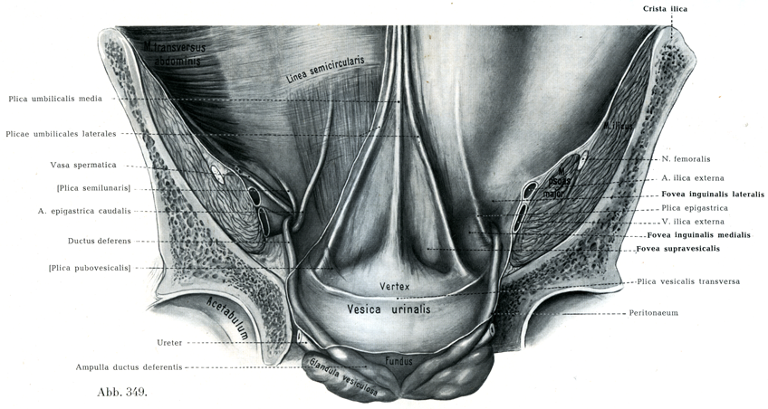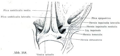 臍の下方には3つのひだがあり,そのうちの1つは正中に,他の2つは外側にある.これらはみな臍に終わっている(図348, 349).中臍ヒダPlica umbilicalis mediaは臍尿管索Chorda urachiを含んでいる.外側臍ヒダPlicae umbilicales lateralesは膀胱の側面から内側上方にすすんでおり,左右それぞれ閉鎖した臍動脈,すなわち臍動脈索Chorda a. umbilicalisを入れている.これらのひだは翼のように突出していて,その突出する度合いは強いことも弱いこともある.外側臍ヒダのさらに外側には腹壁動脈ヒダPlica epigastrica(図349)があり,これは下腹壁動静脈を包んでいる.これらのひだのあいだにある外側・内側・膀胱上鼡径窩Foveae inguinales lateralis, medialis, supravesicalisについては第I巻,375頁から378頁までと第I巻図497~499を参照されたい.