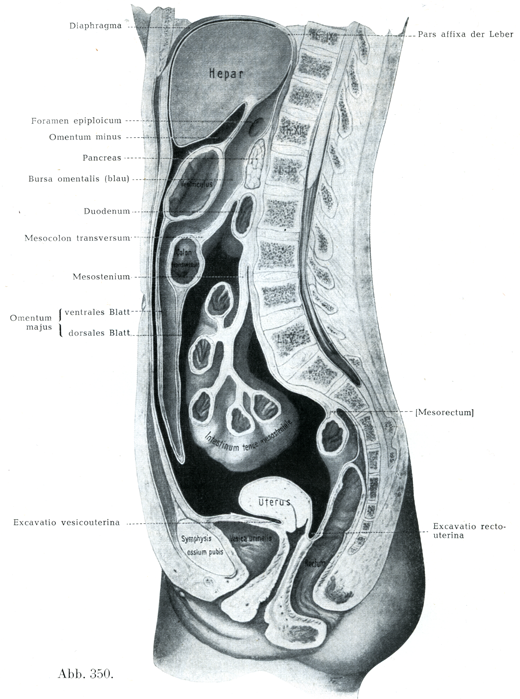 したがって腹膜は(図350)前腹壁と横隔膜から肝臓の横隔面にすすみ,これをその前縁まで被い,ついで肝臓の内臓面にいたり,その中央部で肝門まで達している.肝門からは小網となって胃の小弯にいたり,胃の前面を被って大弯に達し,その下方で大網の前葉を作り,その下端の自由縁で折れかえって,逆行して脊柱まで達する.脊柱からは下方にすすんで横行結腸を被い,ふたたび脊柱に戻っている.それによって2枚の膜からなる横行結腸間膜が作られている.