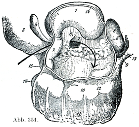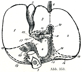 肝臓はその前縁を上方に向けている.図352と図353を合せて観ること. 1 右葉;2 左葉;3 方形葉;4 尾状葉;4'乳頭突起;4" 尾状突起;5胆嚢;6'膀静脈索とその後方の続きが門脈の左枝に合するところ;7 下大静脈;8,8,8 静脈管索;9 門脈の左枝;10固有肝動脈;11 総胆管;12 門脈の右枝;13肝鎌状間膜の2線が付着部に達して終るところ;14と15 付着部の前界;16~19と17~18付着部の後界;18と19 左右の三角間膜の付着する場所;20 腎上体圧痕;21~22と21~16小網の前葉の起始線;22と17から出て4のまわりをとりまく線網は嚢孔の天井と尾状葉を囲んでいる.これらは網嚢に属するのである.