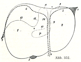 1 右葉;3 左葉;3胆嚢切痕;4 肝切痕と肝鎌状間膜の両葉;5, 6肝臓の付着部の前界;7, 7 右と左の三角間膜;8(7から10まで)付着部の左の後界;9と10 (左)矢状裂の静脈管索部を下行し,さらに肝門をとりまく2つの腹膜線;9 小網の前葉の起始線;10 小網の後葉(すなわち網嚢の前壁)の起始線;11尾状葉の後端;11と12網嚢の後葉の起始線と付着部の後界;13(7から*まで)付着部の右の後界;14 尾状葉の領域;* 尾状突起.