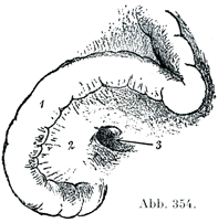 [図354]S状結腸間陥凹 S状結腸を上方にあげて,S状結腸間膜の左側板がみえるようにしてある.1 S状結腸;2 S状結腸間膜;3 S状結腸間陥凹の入口.
