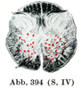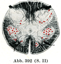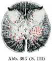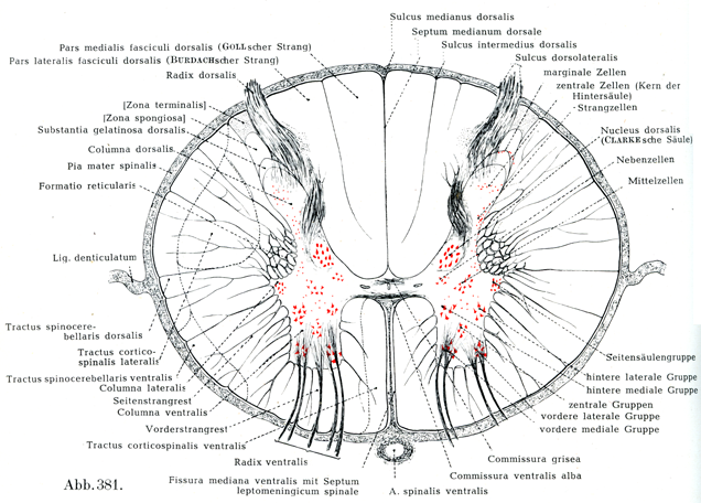 [図381]脊髄の横断模型図 柔膜および歯状靱帯をつけてある. 神経細胞は赤で示す.