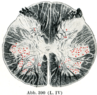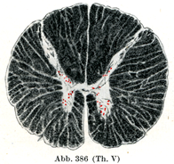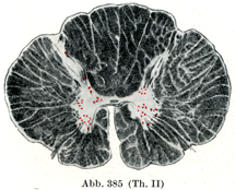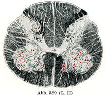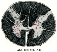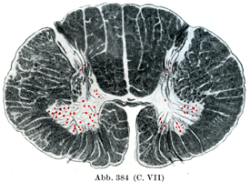 出て行く神経根Nervenwurzelnに関しては,次のことが明かである,脚すなわち脊髄のある部分で根線維がたくさん出ていればいるほど,横断面での灰白質の広がりはいっそう大きいのである.そして灰白質は体肢への大きな神経がおこっている高さで最も強大なのである.