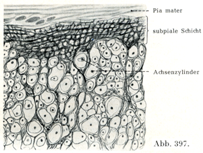 白質内のグリアは大部分が線維性グリアである(第I巻,図138).上衣線維も白質のグリアの中に進入している(図382).このグリアが髄外套の内面では灰白質と続いており,またその外面ではだんだんとよく発達して,密な薄い1層をなし,この層はもはや神経要素を全く有たず,脊髄の全体を被う一とつづきの被膜を形成している.すなわち,柔膜下層subpiale Schicht, Rindenschicht, Hornspongiosaあるいは浅境界膜Membrana limitans superficialisとよばれるものである(図397).