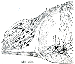 グリア細胞の最も細い突起はいわゆる汎在基礎網“atlgemeines Grundnetz”(289~291頁参照)の構成にあずかっている.これらの突起はBauerによるとおそらく汎在基礎網の中に加わって,その抑制装置Hemmungsapparatをなしており,刺激の通路,刺激の集成および刺激抑制の過程に何らかの役割をしているのであろうという.