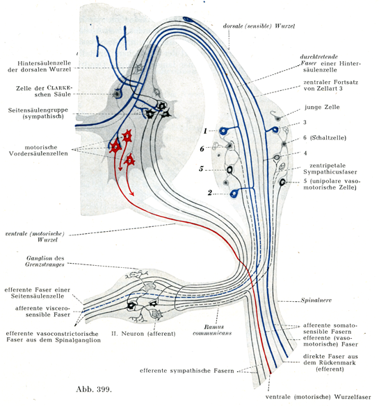 (交感神経性の)側柱Seitensäuleの細胞もまた前根細胞の一部である.その神経突起は交感神経幹の神経節に達している(図399).