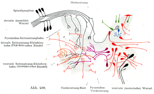 右側:黒は運動性細胞で,その神経突起に側枝がある;赤は前側索に線維を出す索細胞,その中にはまたクラーク柱の細胞およびローランド膠様質の辺縁帯の細胞もそれぞれ1つずつ含まれている;前索細胞の側枝がよく発達していることに注意せより紫は交連細胞,この種に属する「短い」突起をもつ細胞の1つを斜線で示してある; 緑は後索細胞,小さい細胞はローランド膠様質の細胞である;青は短い神経突起を有つ細胞;9 側索基礎束.左側:黒は脊髄神経節の細胞,後根,その分岐部および灰白質のいろいろな領域に終る側枝,しかも左から右へ次の順序になっている:後柱における終末,灰白質の中間部における終末,前柱における終末(反射側枝Reflexkollateralen), クラーク柱および他側の後柱における終末;赤は前側索の側枝として総括されうるもの;紫は交連細胞の神経突起の側枝;褐は錐体路の側枝の終る様子.