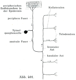脊髄のなかに入ってきた線維はそれぞれ2本の枝に分れ,その太い方の枝は上方に向かって走り,細い方の枝は下方に向かって走る.上方に走る枝のうち,一部のものだけが延髄に達し,他のものはそれより段々と短い距離で終わっている.それに従って長い線維lange Fasern oder Bahnenと短い線維kurze Fasern oder Bahnenを区別する.下方に向かって走る枝はみな短いのである.1つの根に属する線維はたがいに密接して並んでいるので,変性の時にははっきりと境された部分で見えるのである.それは横断面ではコンマの形をしていて,シユルツェのコンマSchultzesches Komma(コンマ束Kommabündel)と呼ばれる.これらの枝からは,数多くの細い側枝Kollateralenがでて直角に灰白質の中に入る.上行および下行する両枝の末端は終末側枝terminale Kollateraleとなって灰白質の中に入っている.そのうえにまだ分岐していない線維からも少数の側枝が出ることがあって,この側枝は灰白質の内部で終末分枝Telodendron, Endbdumchenとなって終わっている.