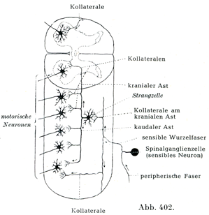 概説.索細胞はその神経突起を同じがわおよび反対側の脊髄索のなかに送っている.反対側にゆくもめは前交連を通っている(図400, 403).これらの細胞は,定まった1群,すなわち交連性索細胞Kommissurenstrangzellen(しばしば短く交連細胞Kommissurenzellenとも呼ぶ)をなして,前柱の内側部にある.別の索細胞の群は前索,側索,後索のそれである.その神経突起は細胞体あるいは1つの樹状突起の小幹から始まって,索線維Strangfaserとして脊髄索の1つに達して,そこを縦走する線維に次に述べるような2様の形で移行している:すなわち単に折れ曲がって多くのばあい中枢の方に向かってすすむか,あるいはT字形に分れるのである.T字形に分れたものの一方が多くはいっそう太い枝であって,これが上方にすすみ,もう1つのものは下方に進む(図402).また長,短いろいろの索線維があって,これらは脊髄の比較的長い部分あるいは短い部分にわたって延びているのである.索線維の最も長いものはおそらくクラーク柱Clarkesche Sduleの細胞から出る神経突起であって,これは小脳にまで達している.索線維は側枝を有っていないことがしばしばである.