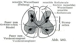 γ)後索に線維を出す索細胞は後柱の後索に接する領域に散在している(図405).その神経突起は密にならんで後交連のうしろで両側の後柱のあいだの角を満たし,後索の腹側部,すなわち後索基礎束Hinterstranggrundbtindelを作っている.