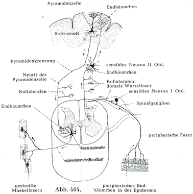 知覚性の側枝のうちで,特に運動性の前柱細胞にまで達して,これに接して終末分枝をなすものは特別な注意を要するのである.これはいわゆる反射側枝Reflexkollateralenである.知覚性の神経線維の興奮がこの側枝を通って直接に運動性の細胞にゆき,脳にまで達することなく,この運動細胞から筋に伝えられる(図405).