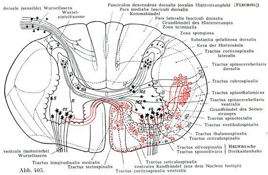 [図405]脊髄における種々の伝導路の領峨を示す(模型図).1つの断面にまとめて書きこんである.赤は下行性の伝導路,黒はその他のもの全部.