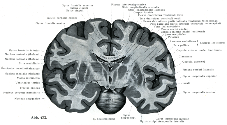 [図432]脳,前額断面III 中間質を通って切断し,後方の切断面を前からみる.(9/10)