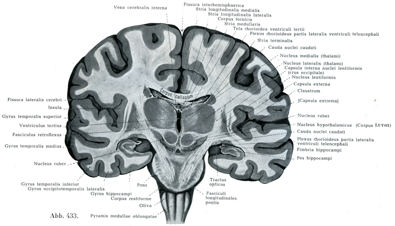 [図433]脳,前額断面IV 後交連のすぐ前を通って切断し,後方の切断面を前からみる.(9/10)