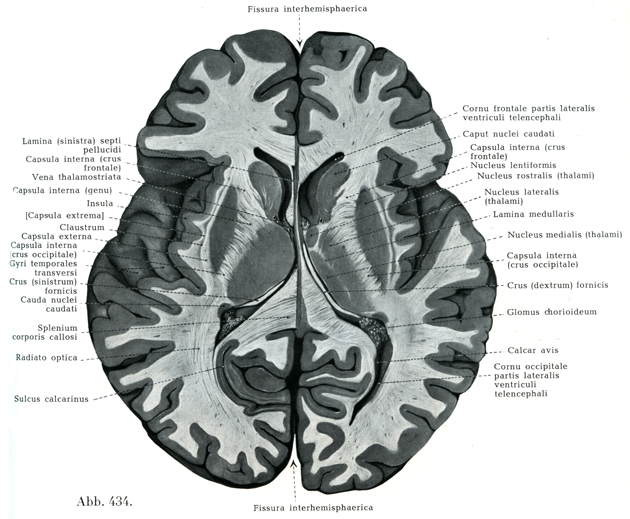 [図434]脳,水平断面I 右側は視床の前結節を通り,左側は(それよりやや深く)室間孔を通る断面.切断された下の断面を上からみる.(4/5)