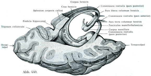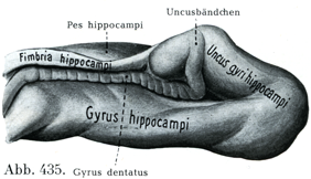 ζ. 海馬溝Sulcus hippocampi(図425),この溝は脳梁溝の続きであって,はなはだかくれた位置にあり,歯状回と海馬傍回とを分けている.