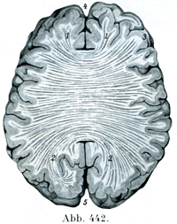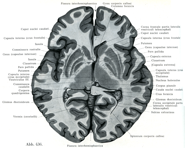 [図436]脳,水平断面II 右側は室間孔を通り(しかし図434の左側よりもいくらか深い),左側は前と後の両交連の中央部を通る切断面.(4/5)