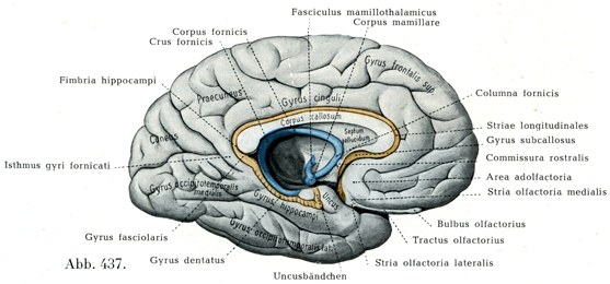 [図437]左大脳半球の内側面.(1/2) 脳弓および海馬采は青,梁下回・内外の両縦条・小帯回・歯状回は黄で示す.(引取線の説明のうちUncusbändchenは鈎小帯を意味し,後述のジアコミニ縁帯と同じものである.(小川鼎三))