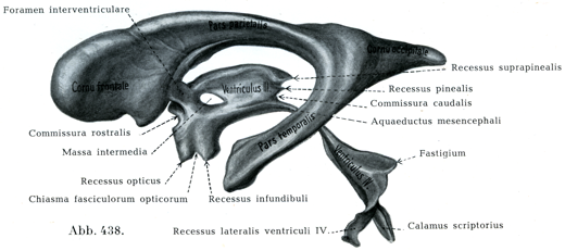そしてこれは第三脳室脈絡叢の下面を被っている幅め狭い上皮板に続くのである.室間孔に達すると髄ヒモは後方に曲がって視床脈絡ヒモとなる.この視床脈絡ヒモは海馬足の前端で采ヒモに続き,采ヒモは脳弓ヒモに続くのである.