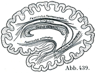 1. 菱脳ヒモTaenia rhombencephali.これは閂(326頁)において始まり,後索の上端の前を斜めに索状体に移ってゆき(図421, 422),第四脳室外側陥凹の縁をなして,ついで小脳に達し,ここでは片葉脚と後髄帆とに沿って虫部小節に達している(330頁).それゆえ菱脳ヒモは他側のそれといっしょにして考えると,輪状をなしている.