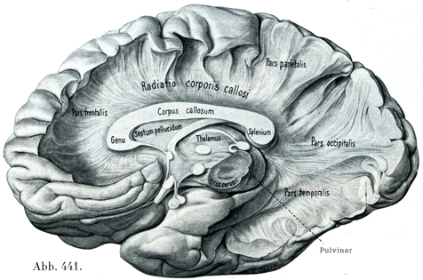 側方は左右の脳弓脚によって境されて,そのあいだに張り,主として横走する線維よりなる薄い髄板があって,これが脳梁の下面を被っている.この髄板はしばしば脳梁と完全に癒合しないで,ヴェルガ腔Vergasche Höhleという1つの小さい裂隙Spaltraumによってそれから隔てられている.