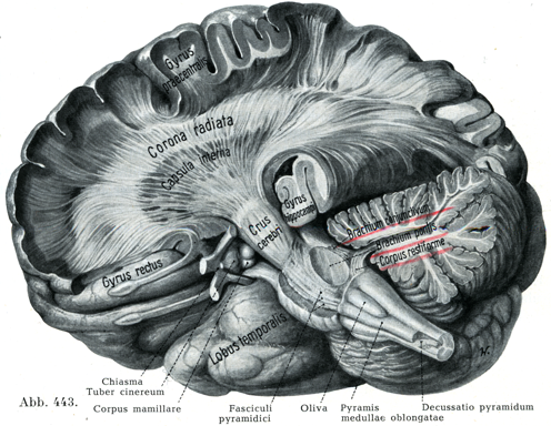 2. 皮質橋核路Tractus corticopontini, Brückenbahnenは,a)前頭部(前頭橋核路)Pars frontalis (frontale Brückenbahn) (アーノルド束Arnoldsches Bündel)は上および中前頭回の皮質で始まり,内包の膝および前脚の領域を通り,大脳脚ではその内側1/5を占めて,橋核の腹方部に終る.